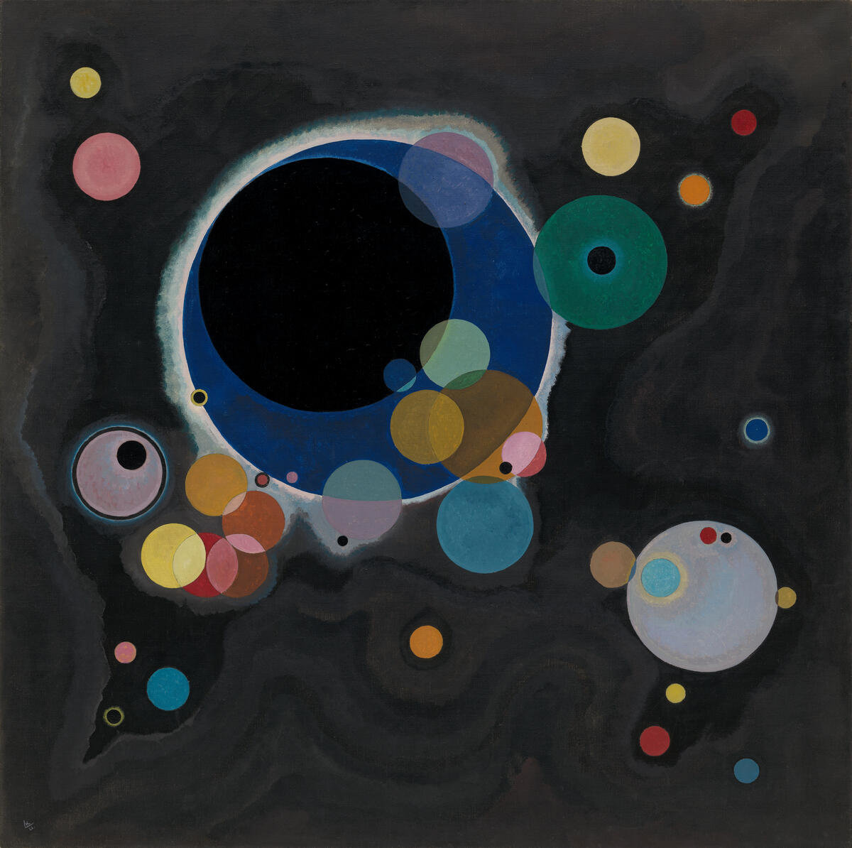 In 1922 Kandinsky joined the faculty of the Weimar Bauhaus, where he discovered a more sympathetic environment in which to pursue his art. Originally premised on a Germanic, expressionistic approach to artmaking, the Bauhaus aesthetic came to reflect Constructivist concerns and styles, which by the mid-1920s had become international in scope. While there, Kandinsky furthered his investigations into the correspondence between colors and forms and their psychological and spiritual effects. In Composition 8, the colorful, interactive geometric forms create a pulsating surface that is alternately dynamic and calm, aggressive and quiet. The importance of circles in this painting prefigures the dominant role they would play in many subsequent works, culminating in his cosmic and harmonious image Several Circles. “The circle,” claimed Kandinsky, “is the synthesis of the greatest oppositions. It combines the concentric and the eccentric in a single form and in equilibrium. Of the three primary forms, it points most clearly to the fourth dimension.”