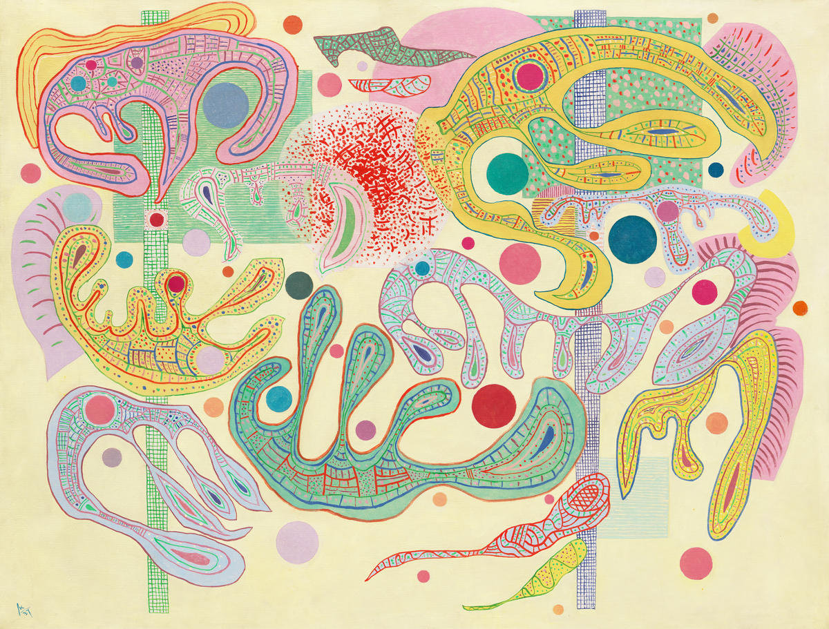 Capricious Forms is a product of the artist at perhaps his most playful moment: interspersed with the clearly delineated circles and squares—the fundamental geometric shapes of his Bauhaus works—are floating and dancing curvilinear figures, all rendered in pastel shades. Several forms can be interpreted as stylized representations of embryo-shaped figures. Additional shapes resemble scientific illustrations of placental tissue, with which Kandinsky (who collected embryological, zoological, and botanical sourcebooks) was undoubtedly familiar. The biological imagery may be read as the artist’s optimistic vision for a not-too-distant future of rebirth and regeneration.